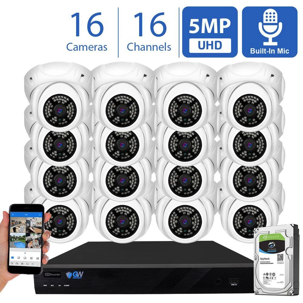 - GW4216EP: 16-channel H265 NVR with 4TB hard drive, 16 x GW5091IP: 5MP turret cameras, 8 x GWCAT100: 100 ft. CAT5 cables, 8 x GWCAT60: 60 ft. CAT5 cables