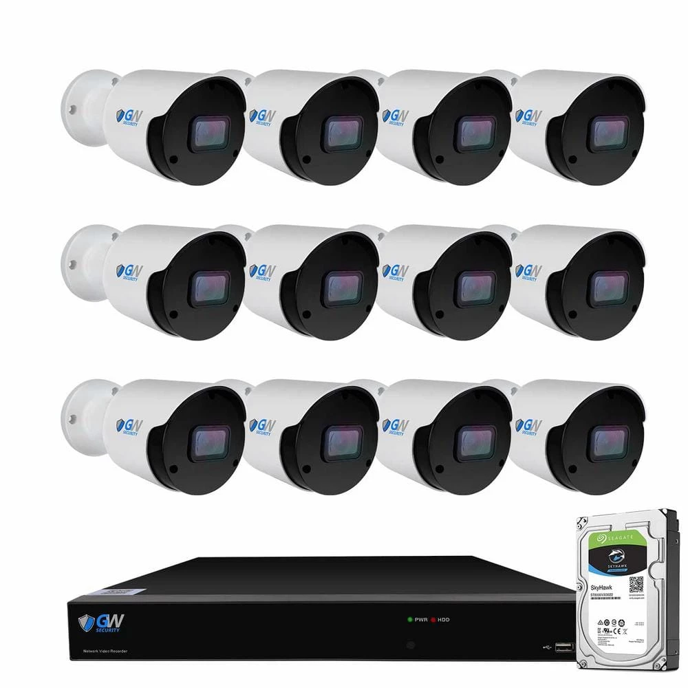 - Package includes: GW5516NPG: 16-channel H265 NVR with 2TB hard drive, 12 x GW8537IP: 8MP bullet cameras, 6 x GWCAT100: 100 ft. CAT5 cables, 6 x GWCAT60: 60 ft. CAT5 cables