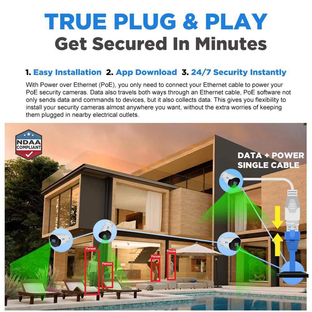 - Easy To Install PoE – Power & data run through a single PoE Cable simplifying the installation process. This gives you the flexibility to install your security cameras almost anywhere you want, without the extra worries of keeping them plugged in nearby electrical outlets.