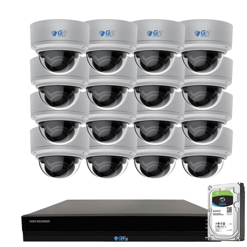 - Package includes: GW7816NP: 16-channel H265 NVR with 4TB hard drive, 16 x GW8171MIC: 8MP dome cameras, 8 x GWCAT100: 100 ft. CAT5 cables, 8 x GWCAT60: 60 ft. CAT5 cables