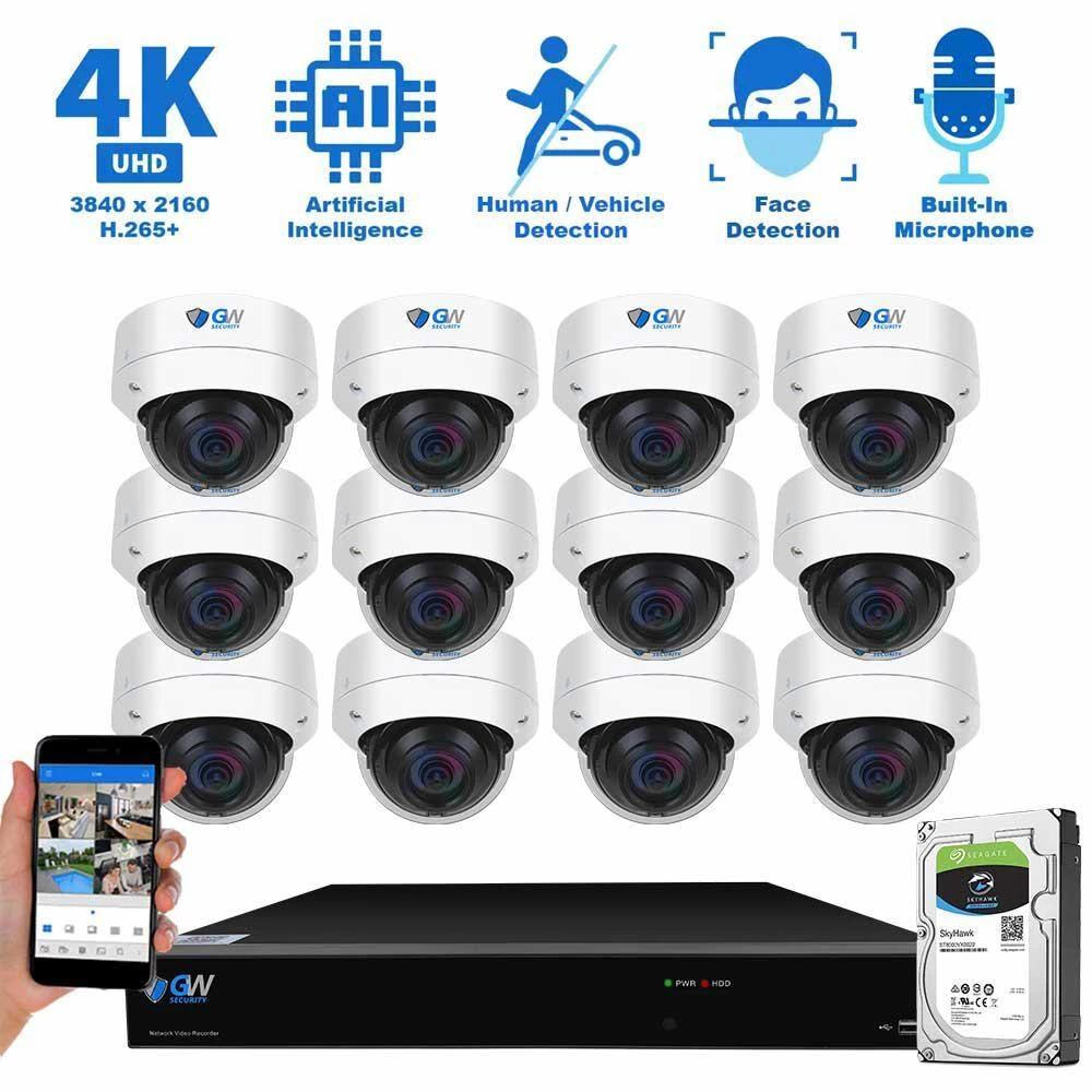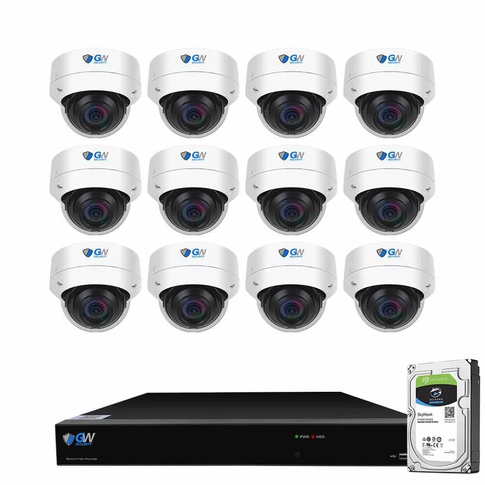- Package includes: GW5516NPN: 16-channel H.265 NVR with 4TB hard drive, 12 x GW8533MIC: 8MP dome cameras, 6 x GWCAT100: 100 ft CAT5 cables, 6 x GWCAT60: 60 ft. cats cables
