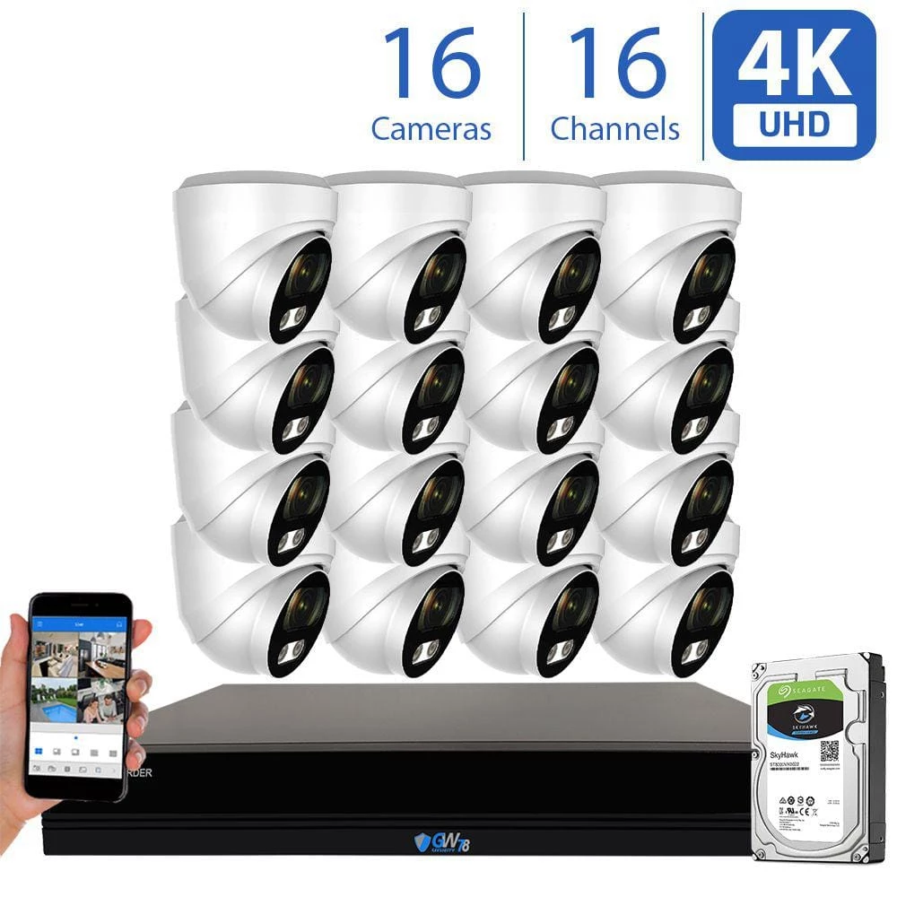 - Package includes: GW7816XVR: 16-channel H.265 DVR with 4TB hard drive, 16 x GW977HD: 8MP turret cameras, 8 x GW100CAW: 100 ft. coaxial cables, 8 x GW60CAW: 60 ft. coaxial cables, 2 x GW12V5A: power supply, 2 x GW128CA: 1 to 8 power splitter,