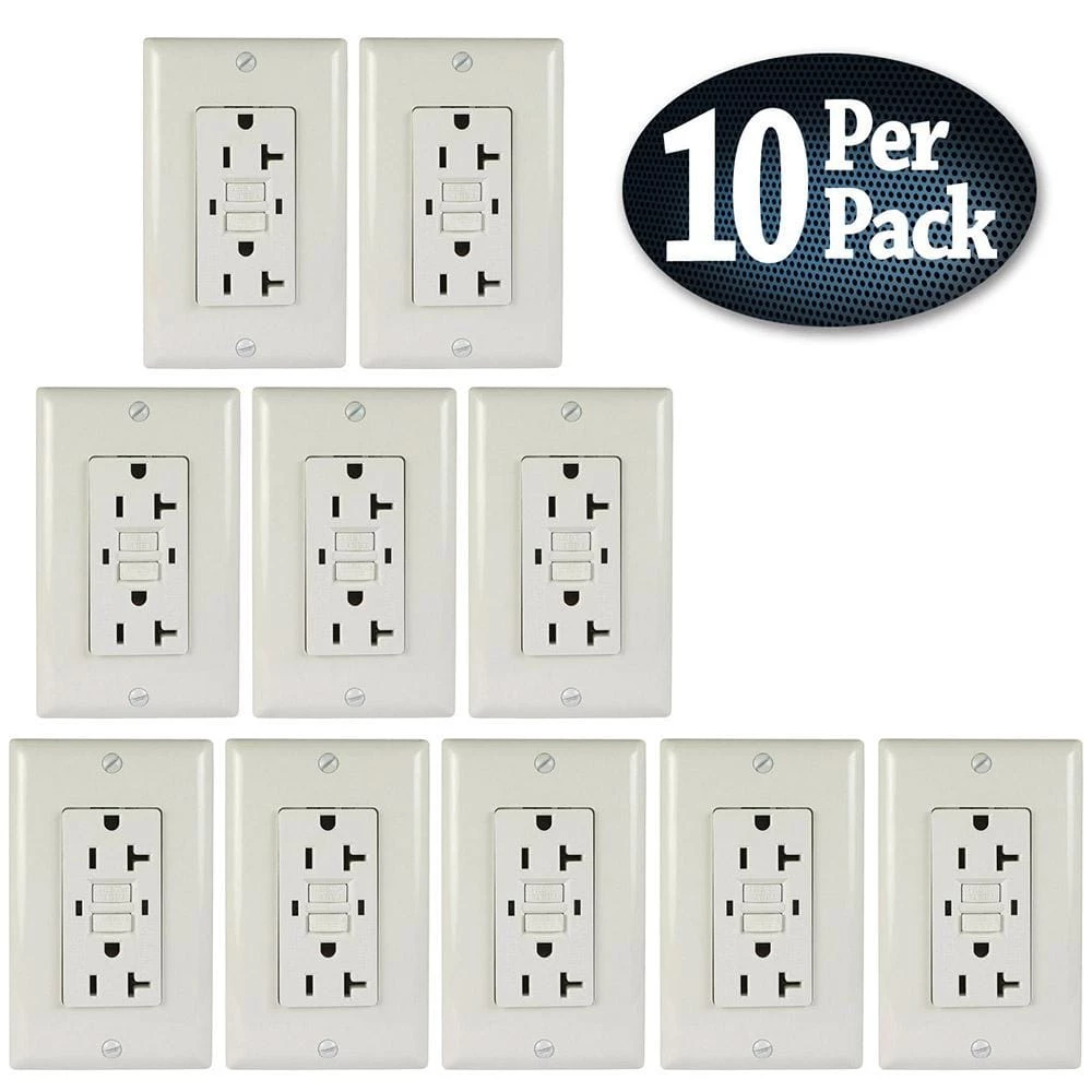 ASI LTG20-10W is package of ten white GFCI receptacles with two 20 Amp AC outlets and matching wall plates. These GFCI receptacles meet the new self-monitoring requirements of self-testing every 120 minutes to ensure that the GFCI outlet is detecting ground fault interruptions. They have LED indicator lights and test/reset push buttons. These GFI outlets can be wired from the side or back and is ideal for new construction projects or for older electrical outlet upgrades.