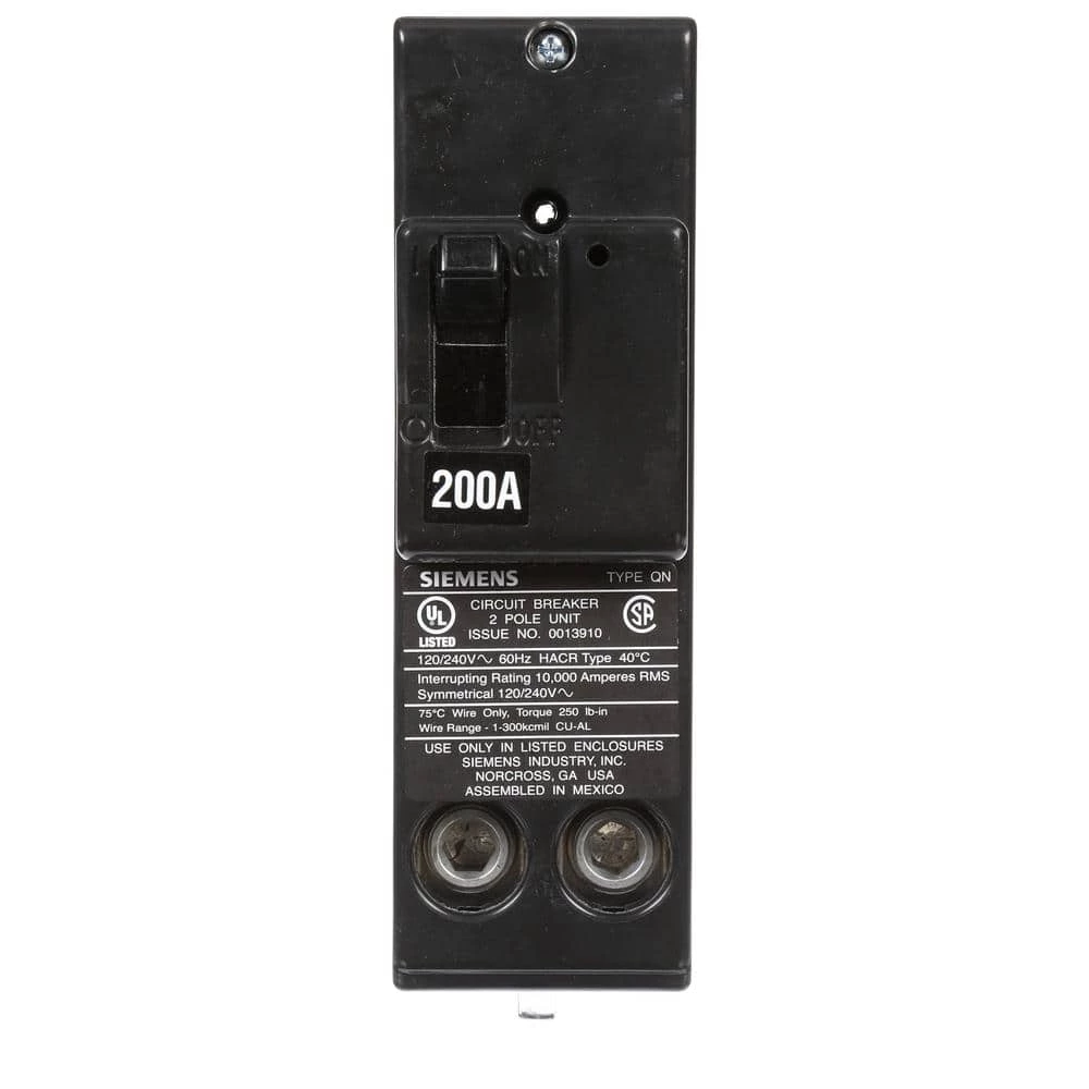 The Siemens 200 Amp Double-Pole Circuit Breaker provides a 120/240 VAC, 10,000 AIC rating for placement in Siemens brand circuit-breaker enclosures and metering installations. This circuit breaker offers a #1-300 kcmil wire range compatible with copper and aluminum conductors. The plug-in design of this breaker allows for quick and easy installation.