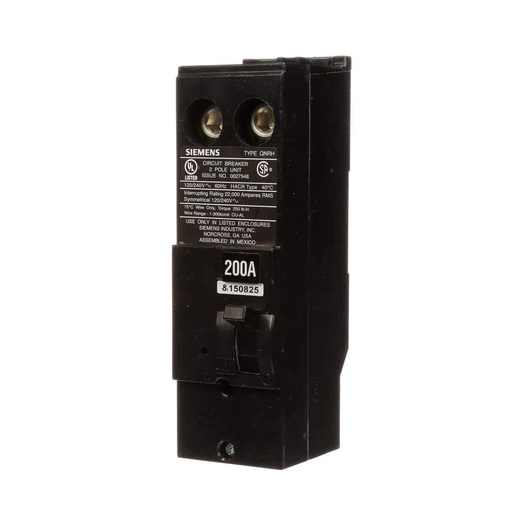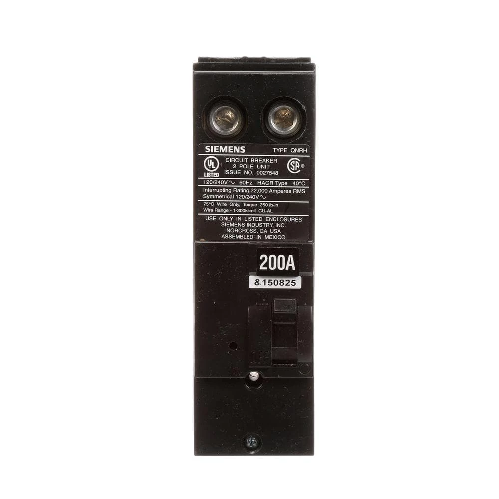 Designed for use with a single-phase load center, the Siemens 200 Amp 2-1/2 in. Double-Pole Circuit Breaker offers a 120/240 VAC and 22,000 Amp interrupting rating. This circuit breaker accommodates copper or aluminum wire connections with a wire size range of #1 – 3000 kcmil. With a UL listing and an ANSI certification, this breaker is rated for safety.