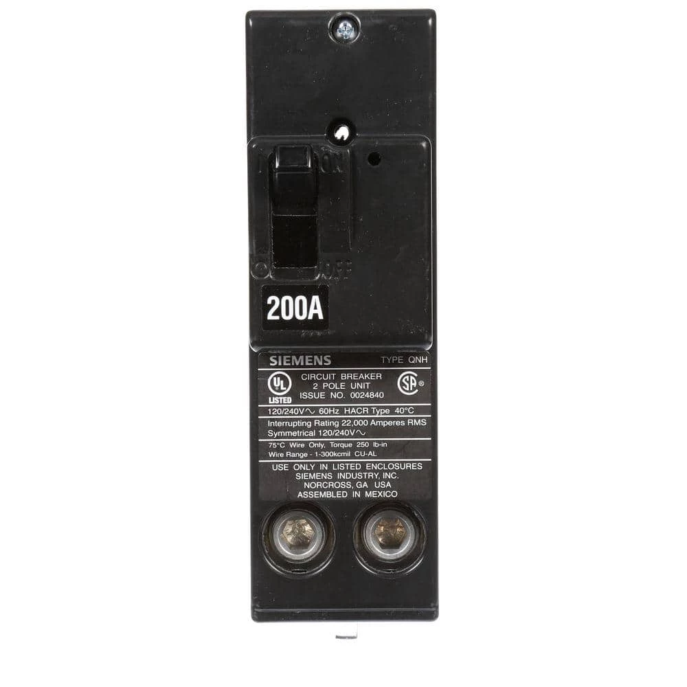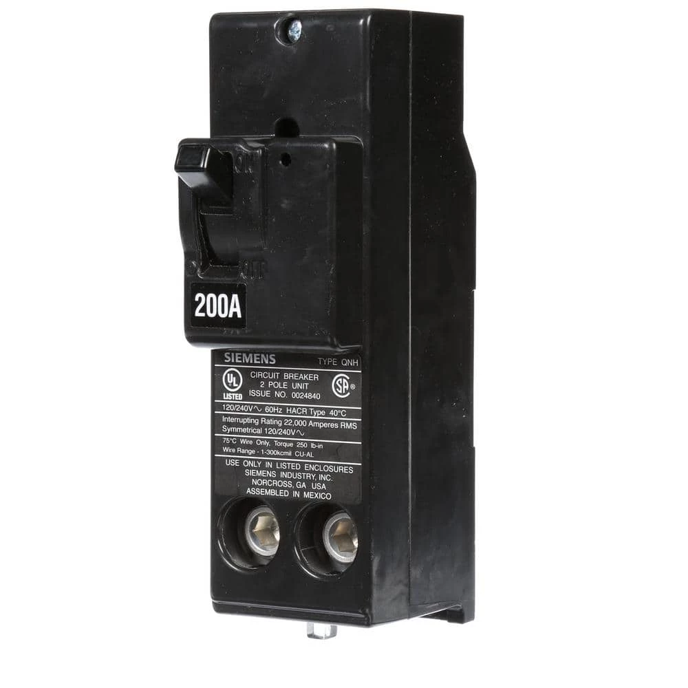 The Siemens 200 Amp Double-Pole Circuit Breaker offers a #4 – 300 kcmil wire range compatible with either copper or aluminum conductors. This circuit breaker requires 2 adjacent spaces and 2 opposite spaces to install in a Siemens brand enclosure. This breaker features a 120/240 VAC capacity and an interrupting rating of 22,000 Amp.
