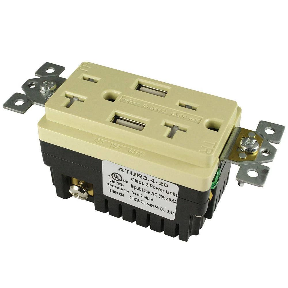 The ATUR3.4 combination ac outlet and USB ports provides the freedom and convenience of recharging your devices while accessing electrical power for other uses. The duplex outlets are UL rated at 20 Amp and are tamper resistant. Smart technology ensures your devices are protected from overcharging. The USB ports share 3.4 Amp total USB charging capacity.