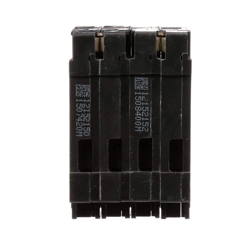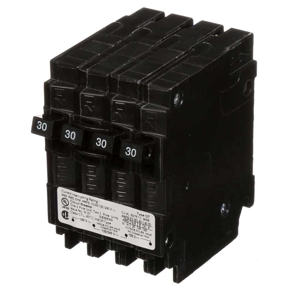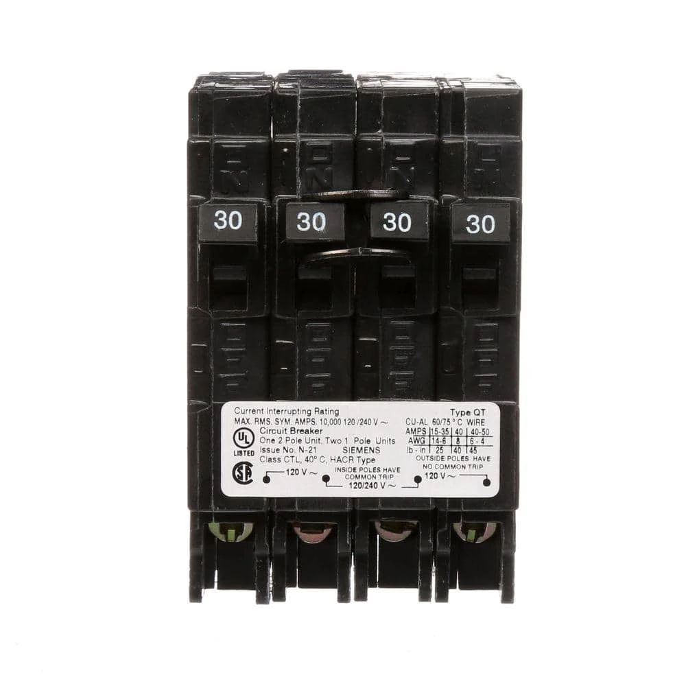 Siemens Triplex Type QT breakers are a 1/2 in. frame per pole and are suitable for use in Siemens panels that allow CTL type QT breakers. This Breaker has (2) 20 Amp Single Pole(s) Breakers and (1) 30 Amp Double Pole Breaker in one 2 in. housing. Siemens strongly recommends against the use of used breakers. The installation of used breakers in a Siemens panel will void the warranty on the panel. Siemens does not sell used breakers and has not approved any 3rd party sellers to do so. Siemens type QT dual circuit breakers are 1 in. wide and consist of (2) 1-pole breakers, in varying combinations of ampere ratings from 15 to 30 Amp. Type QT quad circuit breakers are 2 in. wide and consist of either (1) 2-pole and (2) 1-pole, or (2) 2-pole breakers. 2-pole constructions range from 15-50 Amps and are available with internal common trip. All type QT circuit breakers are plug-in style and load terminals are provided with the units. They are rated for 120/240-Volt AC and calibrated for 40C maximum ambient applications. The standard interrupting rating is 10k AIC.