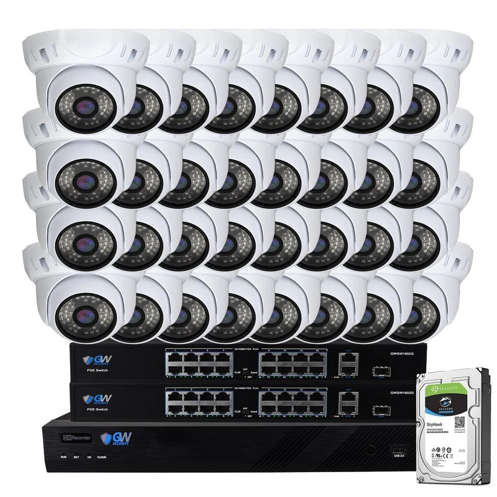 - Package includes: GW4232NS: 32-channel H.265 NVR with 8TB hard drive, 2 x GWSW1602G: 16-port PoE switch, 32 x GW5091IP: 5MP turret cameras, 16 x GWCAT100: 100 ft. CAT5 cables, 16 x GWCAT60: 60 ft. CAT5 cables