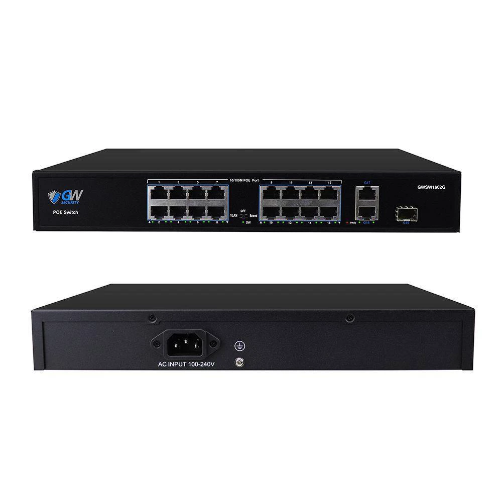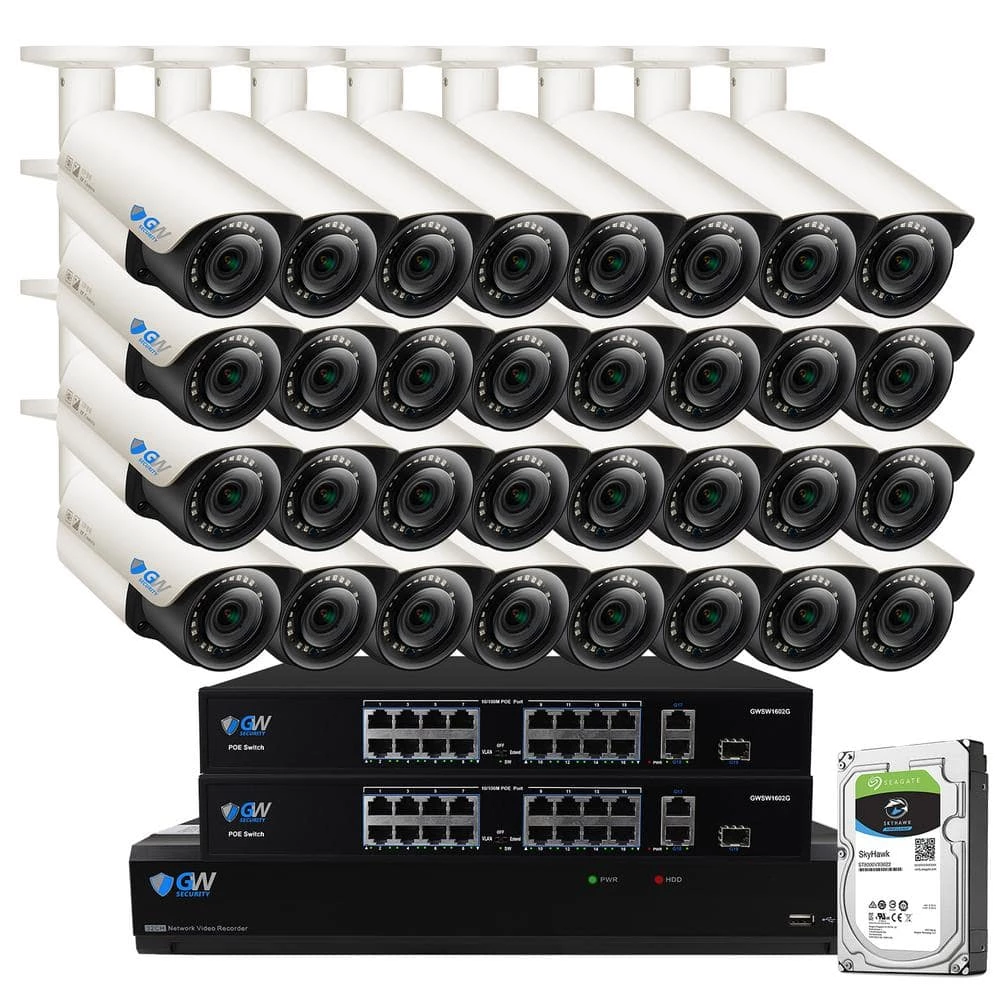 - GW4232NS: 32-channel H265 NVR with 8TB hard drive, 2 x GWSW1602G: 16-channel PoE switch, 32 x GW5050IP: 5MP bullet cameras, 16 x GWCAT100: 100 ft. CAT5 cables, 16 x GWCAT60: 60 ft. CAT5 Ccbles
