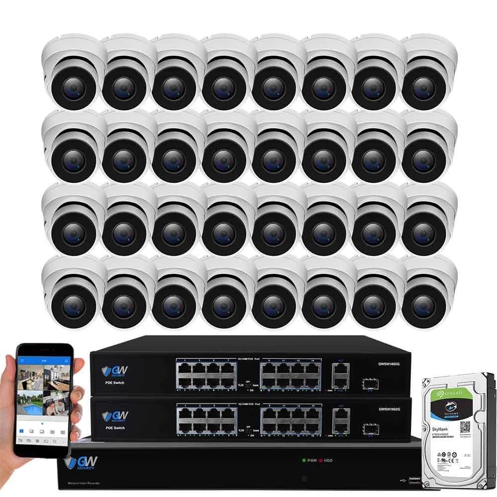 - Package includes: GW5532NPS-V4: 32-channel H.265 NVR with 8TB hard drive, 1 x GWSW1602G: 16-port PoE switch, 32 x GW8536MIC: 8MP turret cameras, 16 x GWCAT100: 100 ft. CAT5 cables, 16 x GWCAT60: 60 ft. CAT5 cables