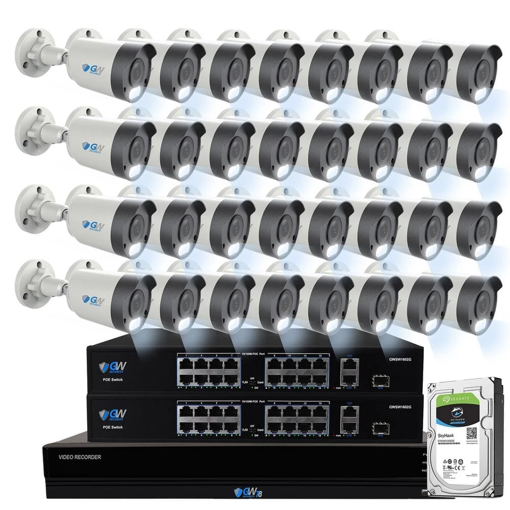 - Package includes: GW7832N: 32-channel H265 NVR with 8TB hard drive, 32 x GW8137MIC: 8MP bullet camera, 2 x GWSW1602G: 32 port PoE switch, 16 x GWCAT60: 60 ft. cables, 16 x GWCAT100: 100 ft. cables