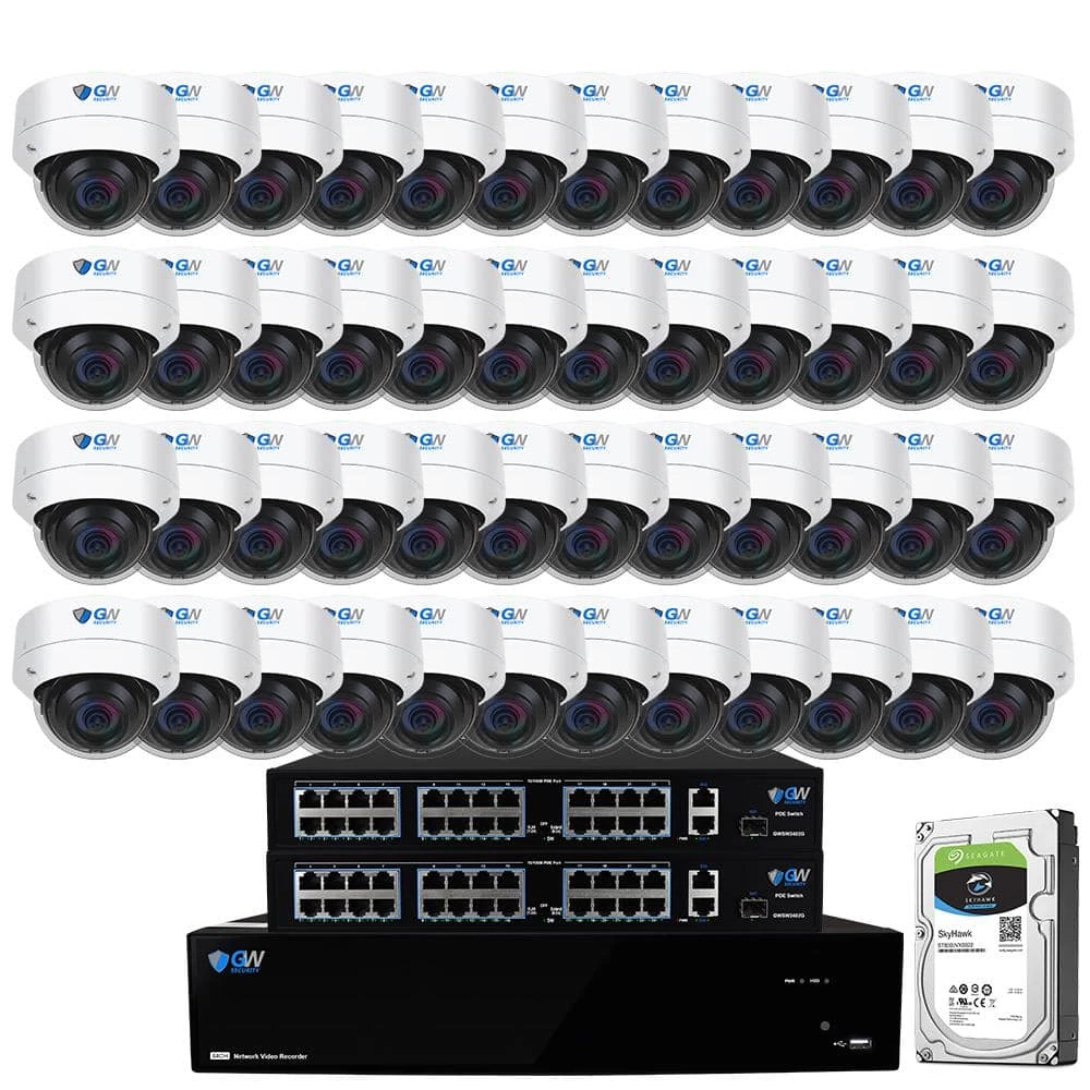 - Package includes: GW5564NS-V8: 64-channel H.265 NVR with 4 x 4TB hard drives, 2 x GWSW2402M: 24-Port PoE Switch, 48 x GW8533MIC: 8MP dome cameras, 24 x GWCAT100: 100 ft. CAT5 cables, 24 x GWCAT60: 60 ft. CAT5 Cables