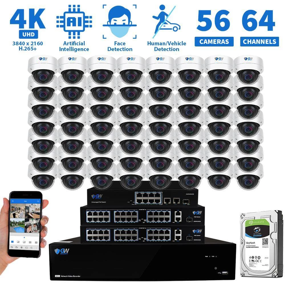 - Package includes: GW5564NS-V8: 64-channel H.265 NVR with 4 x 4TB hard drives, 2 x GWSW2402M: 24-Port PoE Switch, 48 x GW8533MIC: 8MP dome cameras, 24 x GWCAT100: 100 ft. CAT5 cables, 24 x GWCAT60: 60 ft. CAT5 Cables