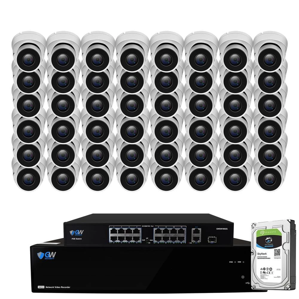 - Package includes: GW5564NP-V8: 64-channel H.265 NVR with 2 x 8TB hard drives, 1 x GWSW1602G: 16-port PoE switch, 56 x GW8536MIC: 8MP turret cameras, 28 x GWCAT100: 100 ft. CAT5 cables, 28 x GWCAT60: 60 ft. CAT5 cables