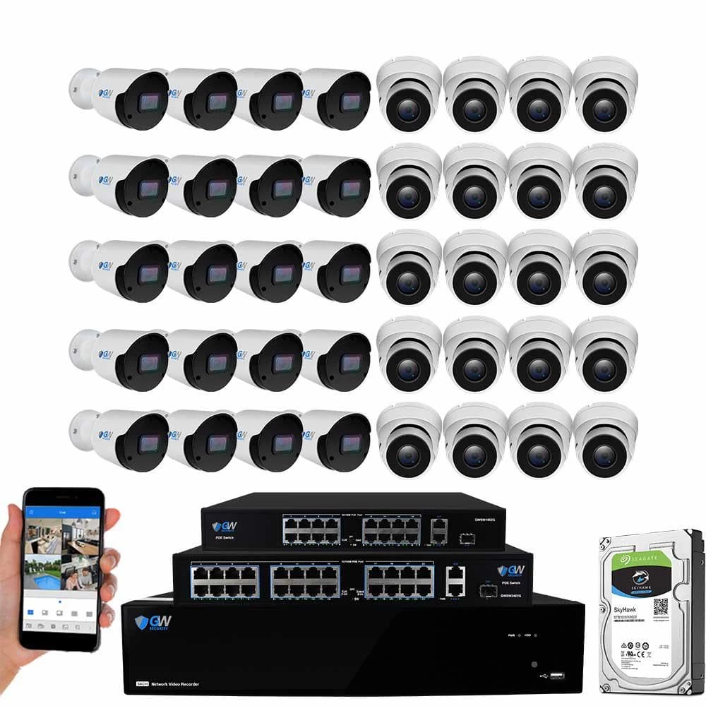 GW8536MIC20-8537IP20-16T is our reliable 16-Channel Security Camera System with unmatched video quality, perfect for any home and business with the need to protect valuable possessions. This ultimate HD security-package comes with 32 8MP IP Bullet cameras, 32 8MP IP Turret cameras, an NVR with a built-in 16TB security-grade hard drive that can store up to 400-hours of video surveillance and can also be upgraded to an astronomical 96TB hard drive capacity for even more-hours. 4K video has 400% more pixels per frame than standard 1080P (2MP) HD. 8megapixels boast 3840 x 2160 resolution, additional pixels make the digital zoom more effective, providing more details at close distances or the ability to digitally zoom in on details at a greater distance than before. Our high performance system uses H.265 compression, H.265 is faster, consumes 50% less data allowing you to store more video to your NVR while also preserving and improving upon superior video quality. The Power over Ethernet setup is clean and simple with a single network cable, built-in P2P service and support of ONVIF protocol. 100% True Plug-and-Play – An additional built-in network interface provides a unique IP address to each security camera, eliminating the hassle of messy IP security camera configurations.