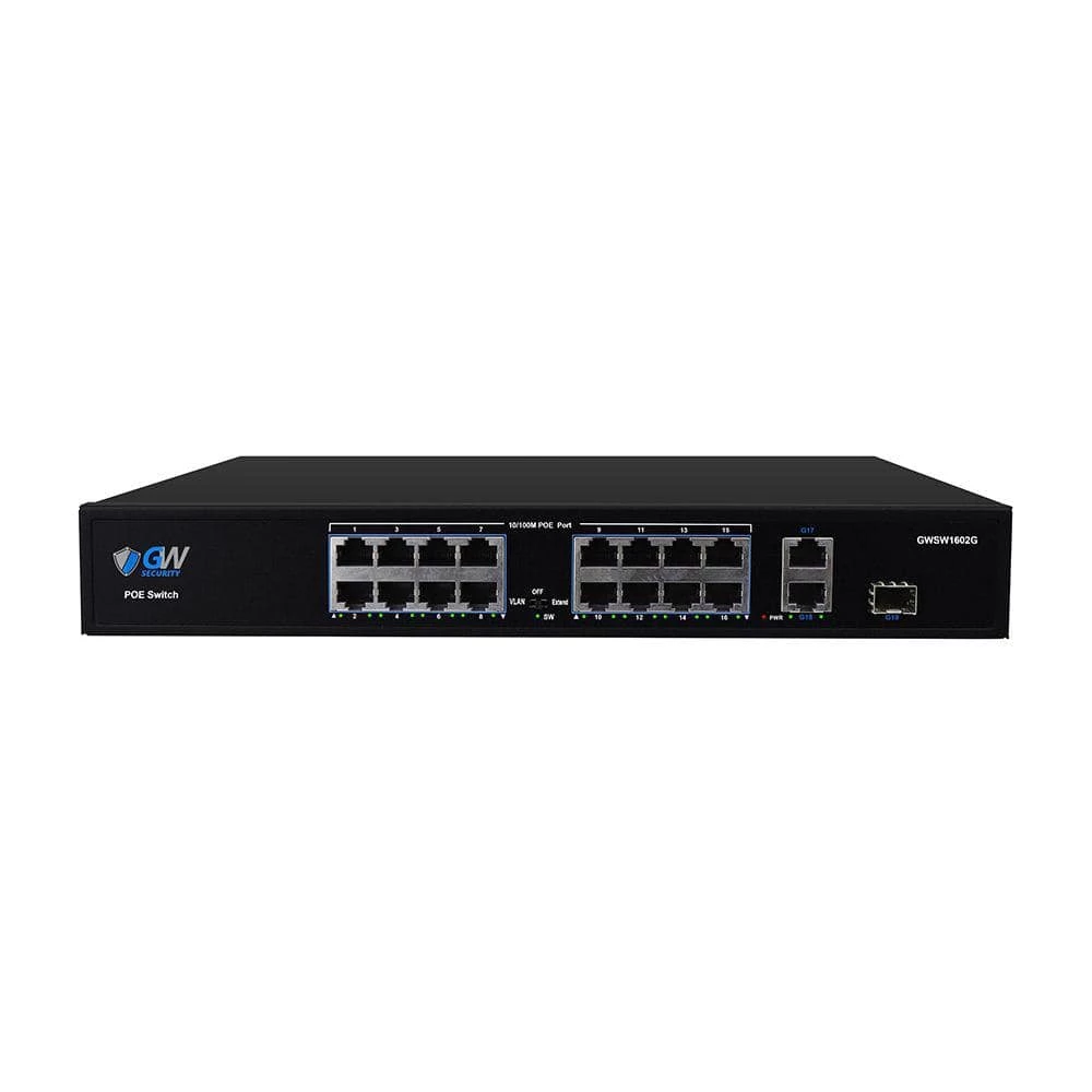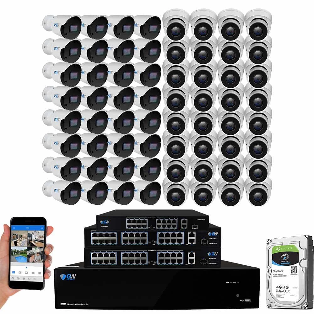 - Package includes: GW5564NP-V8: 64-channel H.265 NVR with 2 x 8TB hard drives, 2 x GWSW1602G: 16-port PoE switch, 32 x GW8536MIC: 8MP turret built-in microphone cameras, 32 x GW8537IP: 8MP bullet cameras, 32 x GWCAT100: 100 ft. CAT5 cables, 32 x GWCAT60: 60 ft. CAT5 cables