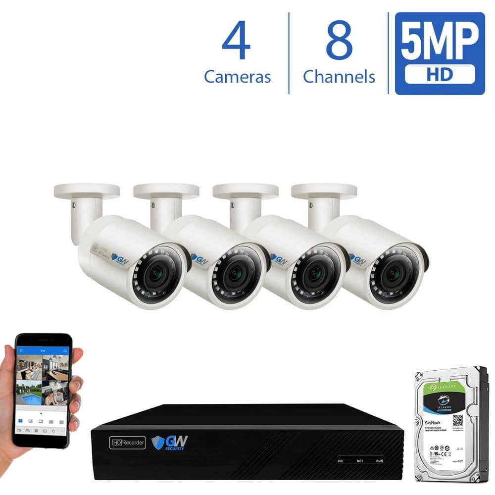 - Package includes: GW4108EP: 8-channel H.265 NVR with 1TB hard drive, 4 x GW5037IP: 5MP bullet cameras, 2 x GWCAT100: 100 ft. CAT5 cables, 2 x GWCAT60: 60 ft. CAT5 cables