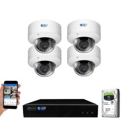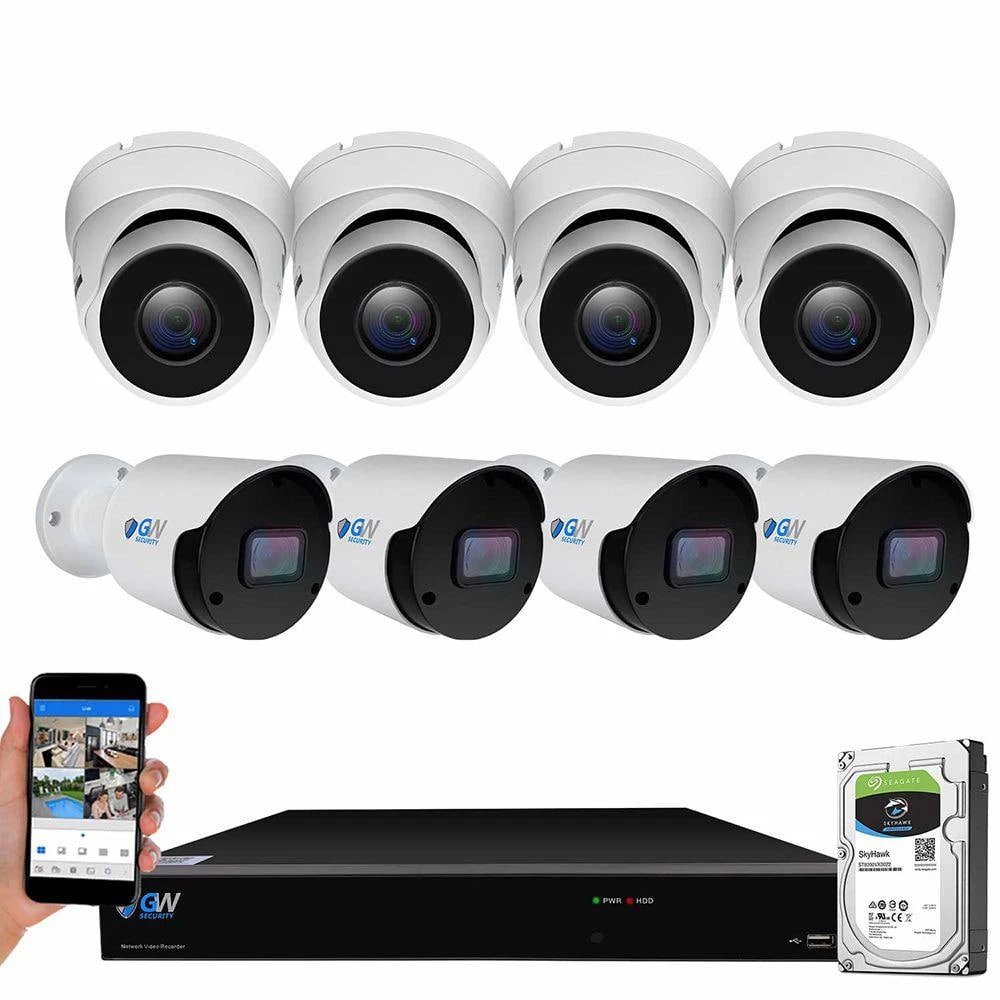 - GW5508NPG: 8-channel H.265 NVR with 2TB hard drive, 4 x GW8536MIC: 8MP turret cameras, 4 x GW8537IP: 8MP bullet cameras, 4 x GWCAT100: 100 ft. CAT5 cables, 4 x GWCAT60: 60 ft. CAT5 cables,
