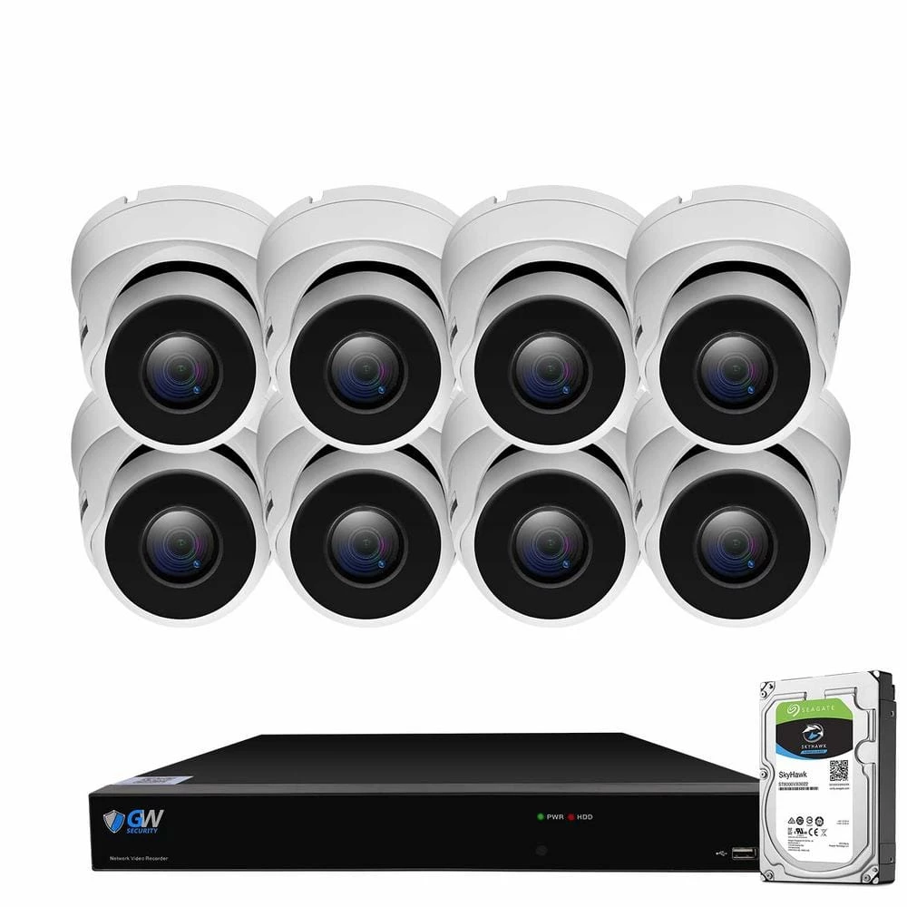- GW5508NPG: 8-channel H.265 NVR with 2TB hard drive, 8 x GW8536MIC: 8MP turret cameras, 4 x GWCAT100: 100 ft. CAT5 cables, 4 x GWCAT60: 60 ft. CAT5 cables