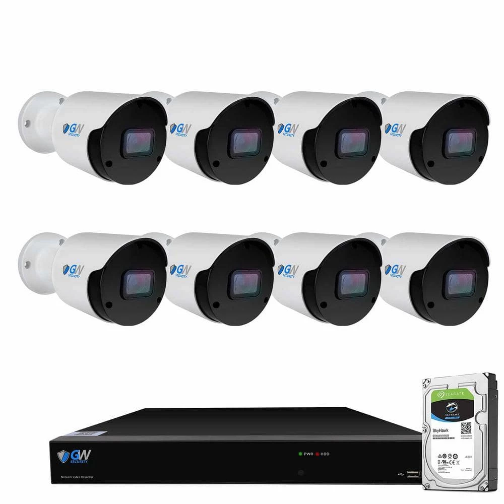 - Package includes: GW5508NPG: 8-channel H265 NVR with 2TB hard drive, 8 x GW8537IP: 8MP bullet cameras, 4 x GWCAT100: 100 ft. CAT5 cables, 4 x GWCAT60: 60 ft. CAT5 cables