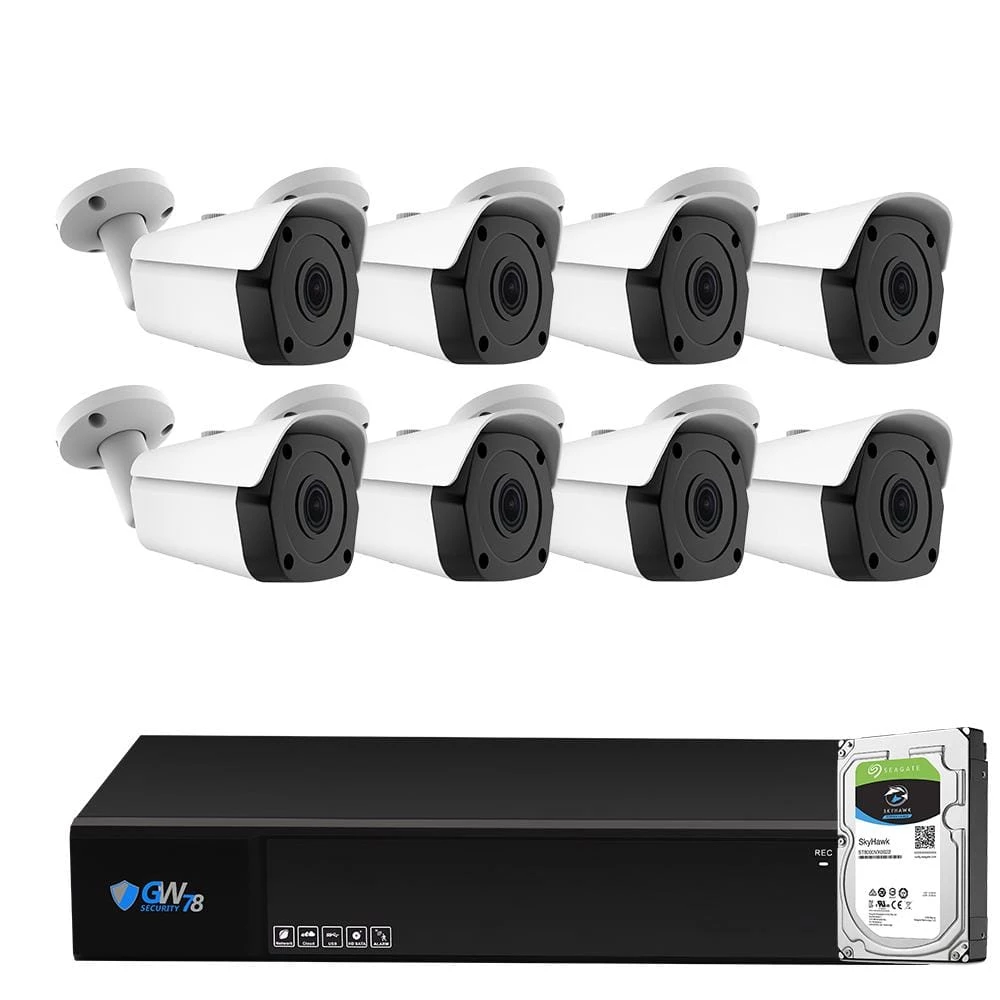 - Package Includes: GW7808XVR: 8-channel H.265 DVR with 2TB hard drive, 8 x GW538HD: 5MP bullet cameras, 4 x GW100CAW: 100 ft. coaxial cables, 4 x GW60CAW: 60 ft. coaxial cables, 1 x GW12-Volt 5 Amp: power supply, 1 x GW128CA: 1 to 8 power splitter