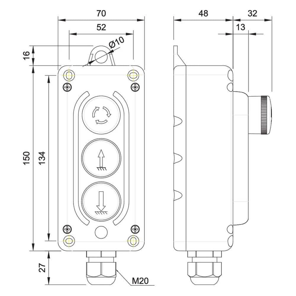 Compact 3 Button Pendant Push Button Station, UP-Down Buttons, 1 Emergency Stop, 1NC/2NO Contacts 3 position compact pendant control station for hoist control and lift control pendant applications. The TLP3. B includes a twist to release emergency stop button and up and down push button switches. The e-stop push button is equipped with a NC contact and the up-down switches are with NO contact blocks. The laser engraved push button switches and emergency stop switch are protected with a shrouded cover to prevent accidental operation. Included with this IP65, NEMA4X rated housing is a M20 cable gland to ensure a watertight installation. Wiring to the contact blocks of the TLP3. B 3 hole pendant station is simplified by the spring clamp wire terminations.