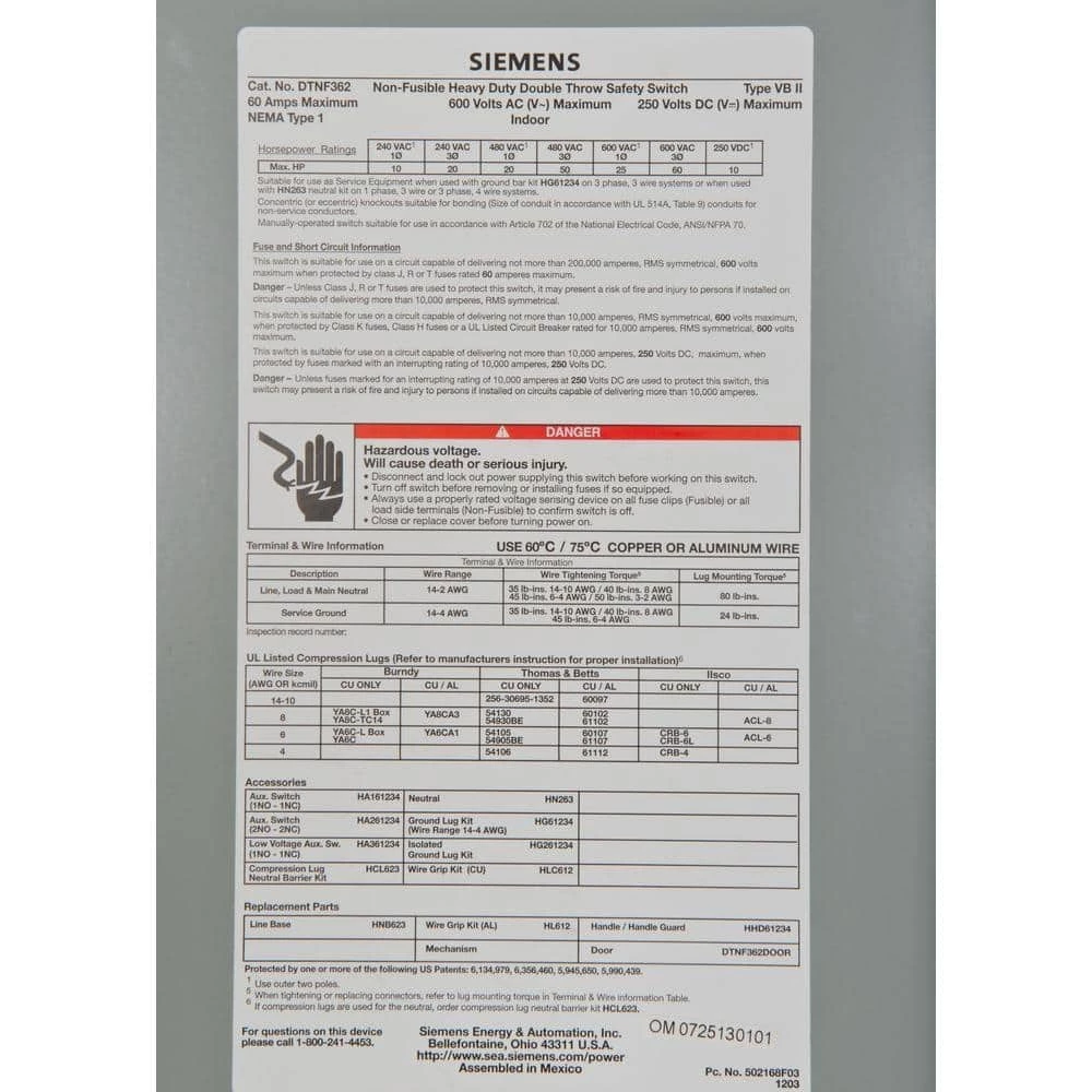 - 60 Amp, 3 phase, 3 pole, 3 wire, non-fusible safety switch