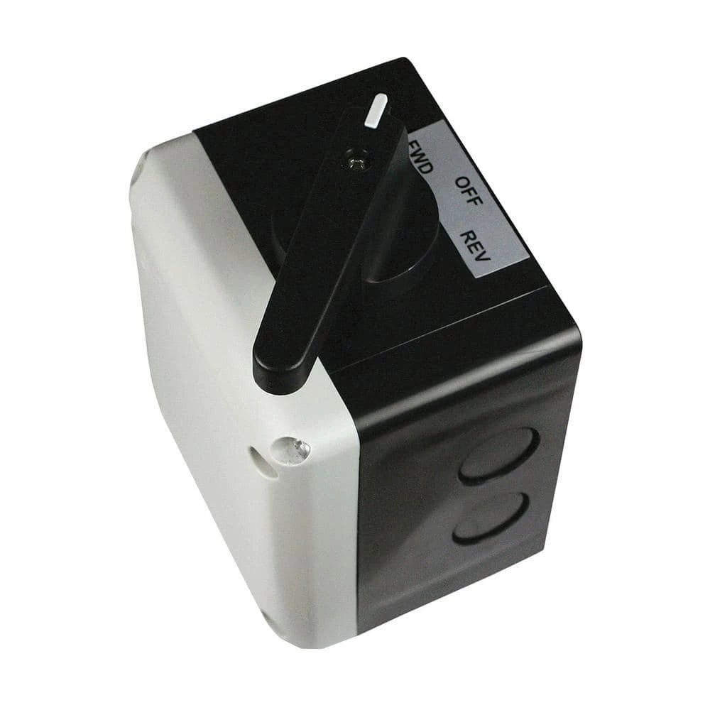 Single-phase maintained motor reversing switch with handle, IP65 enclosure and FWD./REV and UP/DOWN labels. This is a 2 pole drum switch single phase that locks into each operating position and is enclosed in a high impact thermoplastic enclosure. This switch is used with 120 Vac motors or 240 motors. With a UL508 listing of 600 Vac, 20A this forward and reverse motor switch is ideal for single-phase motors ranging from 1.5 HP to 2 HP based on voltage. The wire connections are shock and hazard-proof.
