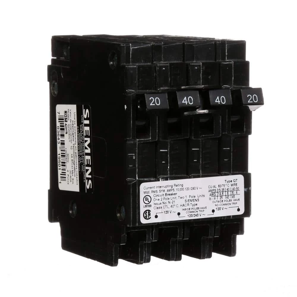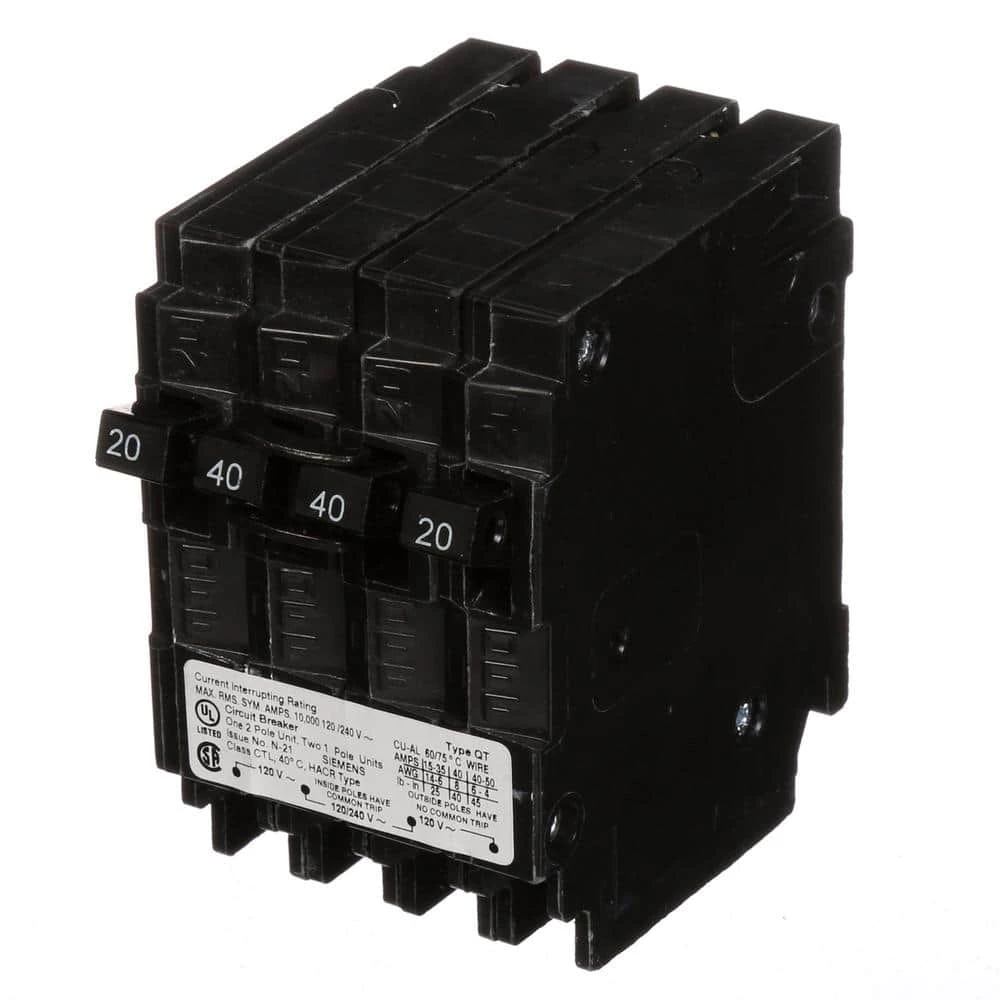- 2-single pole 20-Amp breakers and one double pole 40-Amp circuit breaker