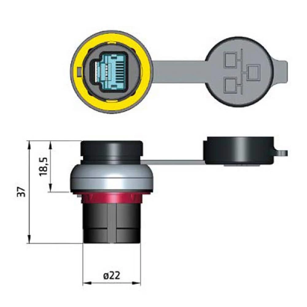Waterproof RJ45 Bulkhead Connector with Protective Cover, Female to Female, 22 mm Mount, Tightening Nut, Nickel Colored Bezel, IP67ASI PP2RJ45NL This weatherproof RJ45 connector comes with an attached protective rubber cap and panel mounts through a 22 mm hole. It has a nickel colored plastic bezel, 2 female connectors, and is fastened with a tightening nut. The ethernet connector can be used with Cat5e and Cat6 ethernet cables is 37 mm from front to back and projects 18.5 mm out when mounted in the panel. Remember to use the cover when not in use to maintain an IP67 rating protecting against dirt and liquids.