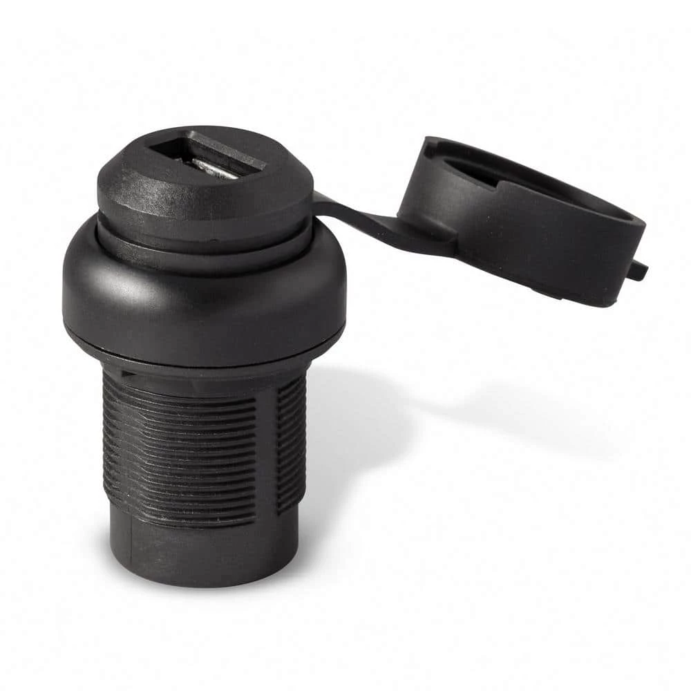 Weatherproof USB 3.0 bulkhead connector provides easy computer access at a panel. When used, the IP67 waterproof cap protects the connector from liquids and debris. A black bezel front, mounts through a 22 mm hole, and is fixed in place with a tightening nut. There are female connections on the front and back.